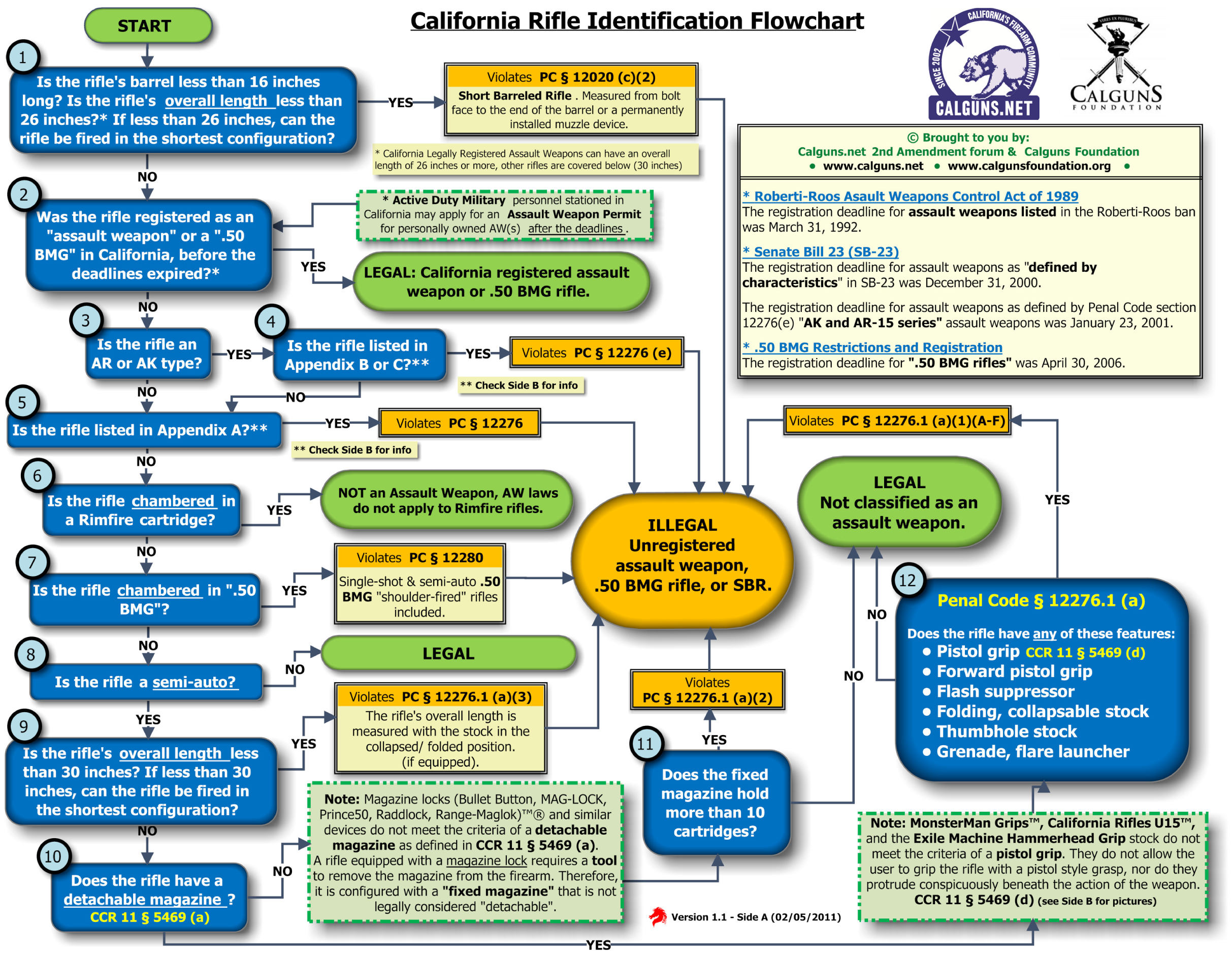 The brilliant minds at www.calguns.net put together this handy flowchart to help people understand the complex assault weapon laws in California. Using this chart you can determine if your center fire rifle is California legal or an illegal unregistered assault weapon. (Download .pdf HERE or click image below to view enlargement)