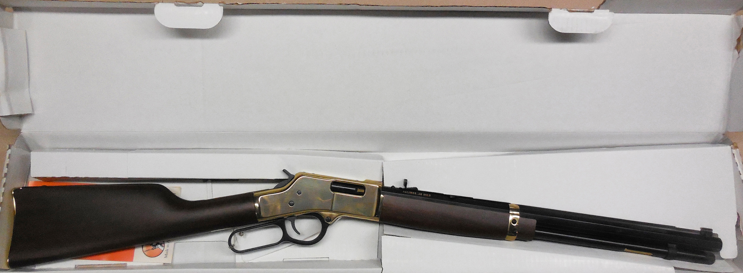 Both the straight-grip stock and forearm are crafted of select American walnut accented with a brass barrel band and Henry’s recognizable brass receiver. All have that crisp, smooth action that sets an authentic American-made Henry apart from other lever action rifles on the range and in the woods today.